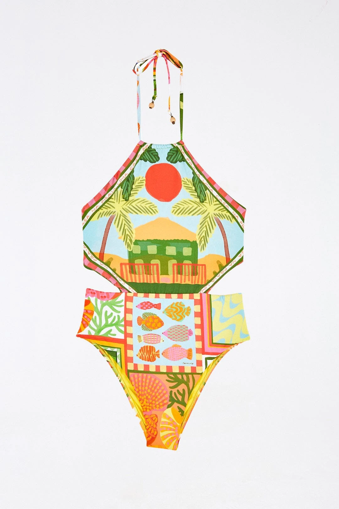 Farm Rio Beach Mixed Scarves One Piece Swimsuit