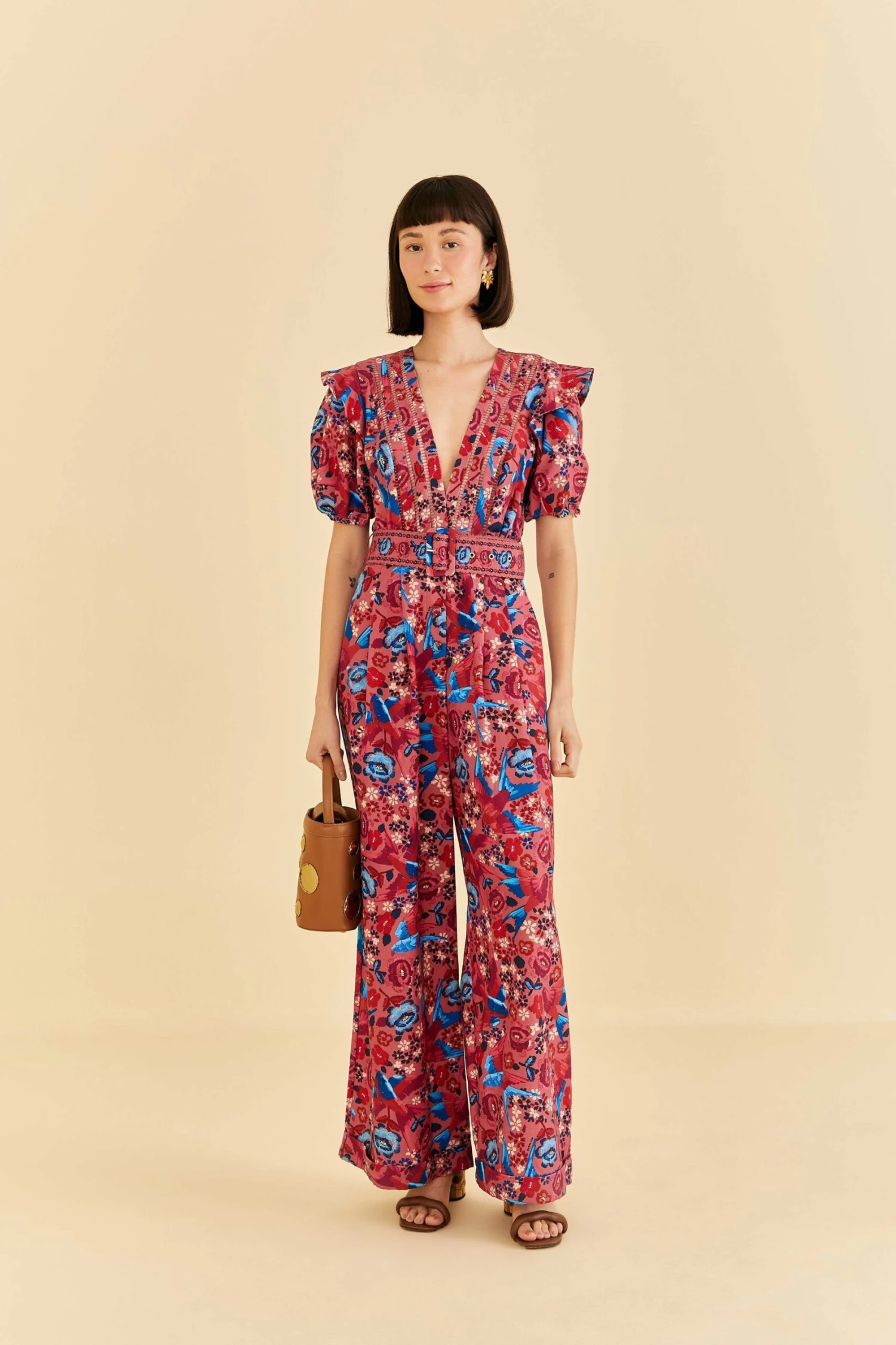 Be the reason why everyone turns their heads with the Blush Floral Birds Jumpsuit. This chic piece is here to be your season’s statement. The nature-inspired print and romantic