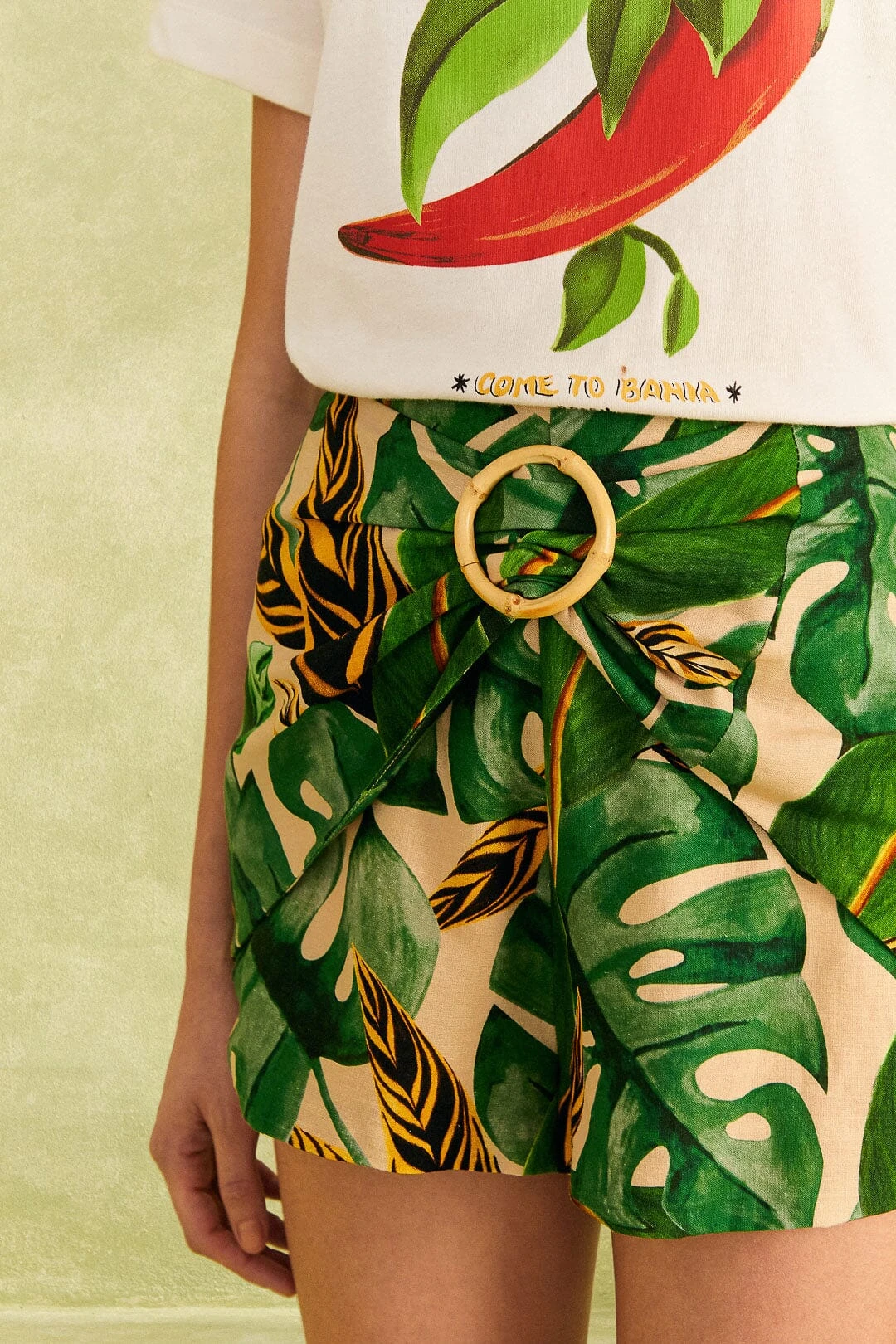 Forget any warm-weather wardrobe drama. Instead, choose a gorgeous fave this Summer. The Tropical Leaves Shorts have a statement-making belt with bamboo detailing and a nature-inspired print that takes it to the boldest level. To create a look that does all the work for you, bring cool tops, fresh shoes, artisanal accessories, and your carefree smile on 🙂